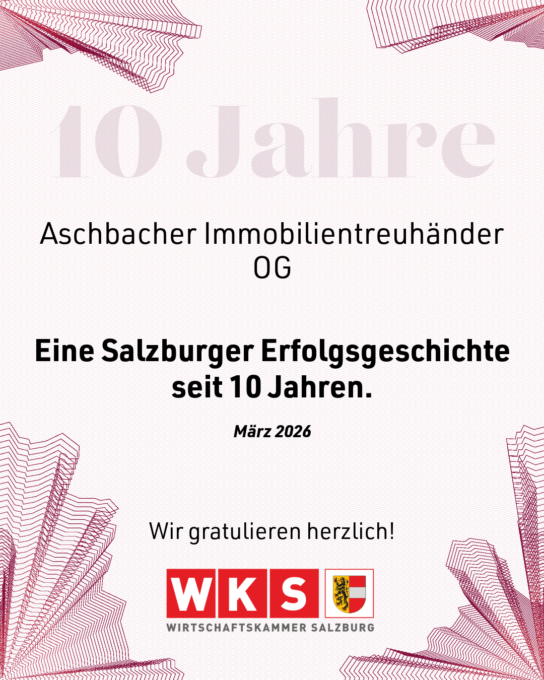 Die Wirtschaftskammer Salzburg hat unser Unternehmen für 10 Jahre Erfolgsgeschichte ausgezeichnet.